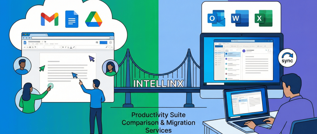In 2026, choosing the right productivity suite matters more than ever. Teams rely on email, collaboration tools, cloud storage, and intelligent workflows to stay productive and secure. Two leaders dominate this space: Google Workspace and Microsoft 365. Although both address the same needs, they differ in experience, integrations, security, and licensing. This guide will help you make a confident, business-aligned decision — and show how Intellinx supports your adoption and migration.